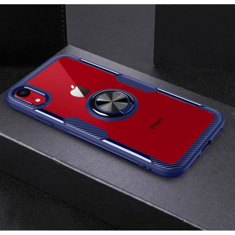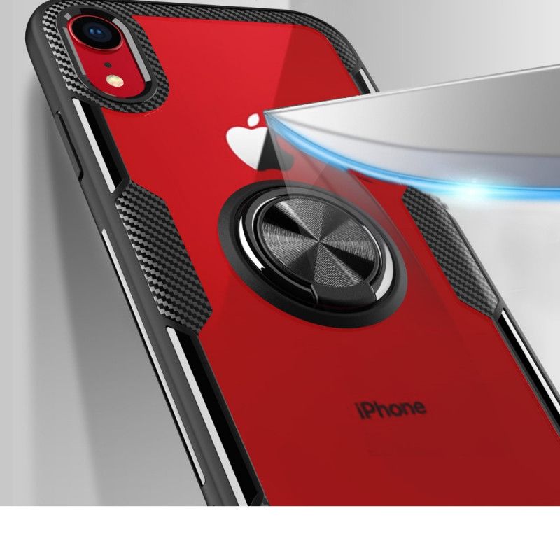 Det gennemsigtige hærdet glas og silikone etui med metalstøttering beskytter iPhone XR, mens den bæres på fingeren.
