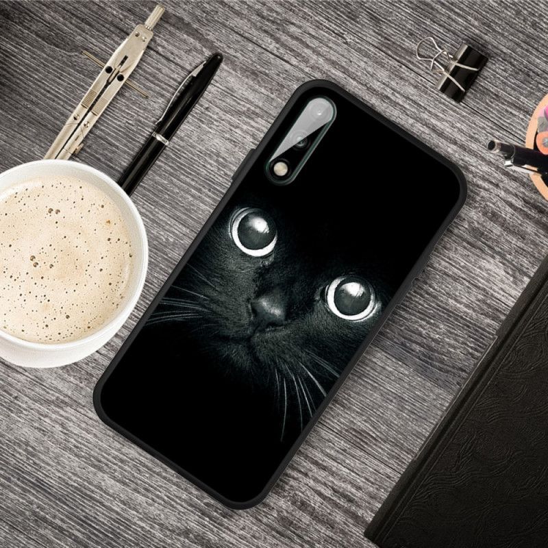 Et cover til Huawei P40 Lite E / Y7p med det forbløffende udseende af en storøje sort kat.