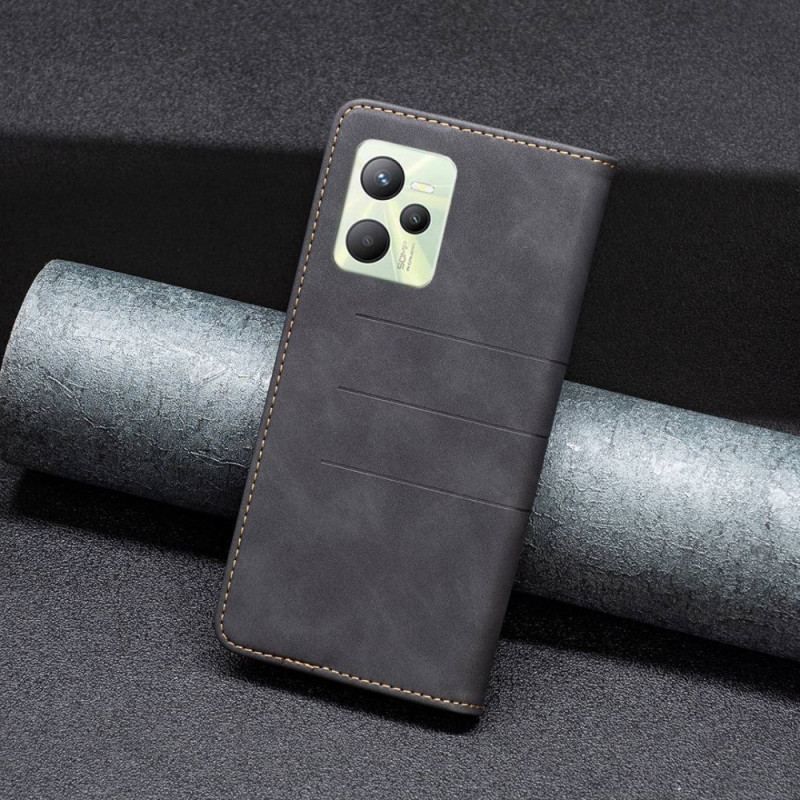 Dette Binfen Color Flipcover Dekoreret Med Vandrette Linjer Er Designet I Kvalitetslæder Og Silikone Til Dobbelt Beskyttelse Af Realme C35.