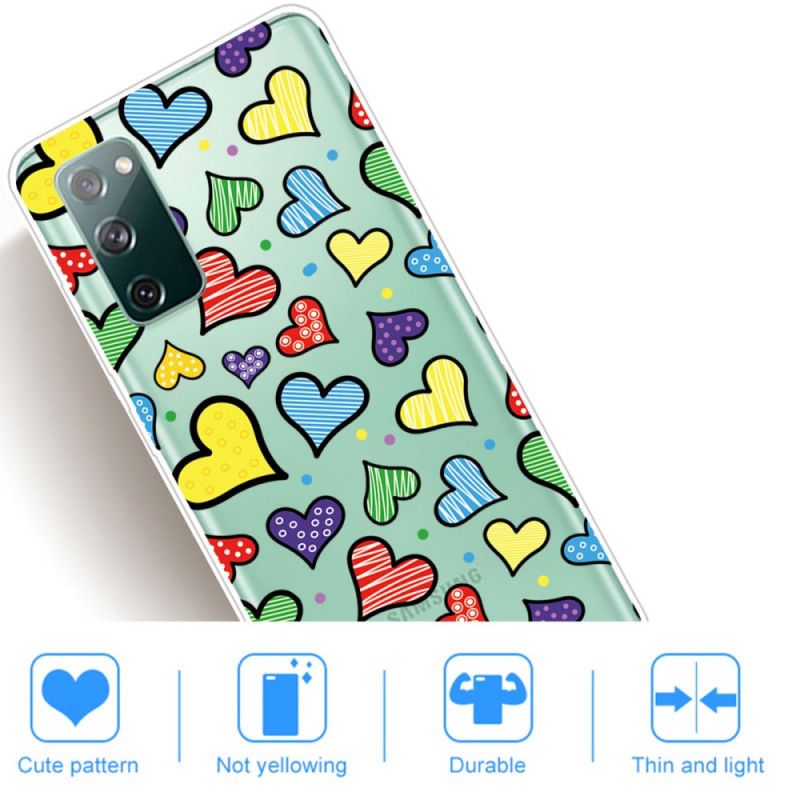 Giv din Samsung Galaxy S20 FE multifarvet hjerter taske, mens du opretholder det originale design af telefonen takket være det gennemsigtige design.