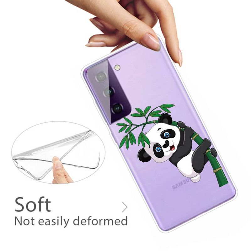 En smuk panda, der har det sjovt på bagsiden af dit gennemsigtige etui til din Samsung Galaxy S21 FE: en unik løsning til at beskytte den!