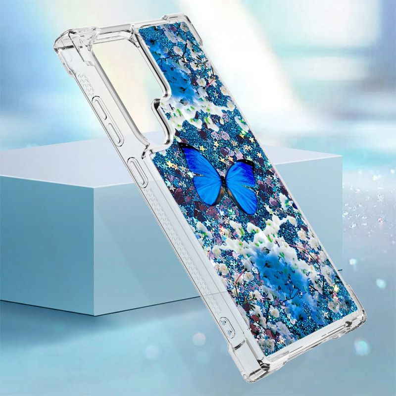 Opdag Vores Glittercover Til Samsung Galaxy S24 Ultra 5G Med Et Blåt Sommerfuglemønster.