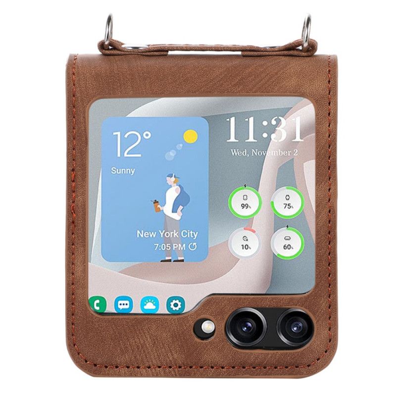 Her Er Et Etui I Imiteret Læder Og Udstyret Med Kortholdere Til At Beskytte Samsung Galaxy Z Flip 5 Med En Justerbar Skulderrem.