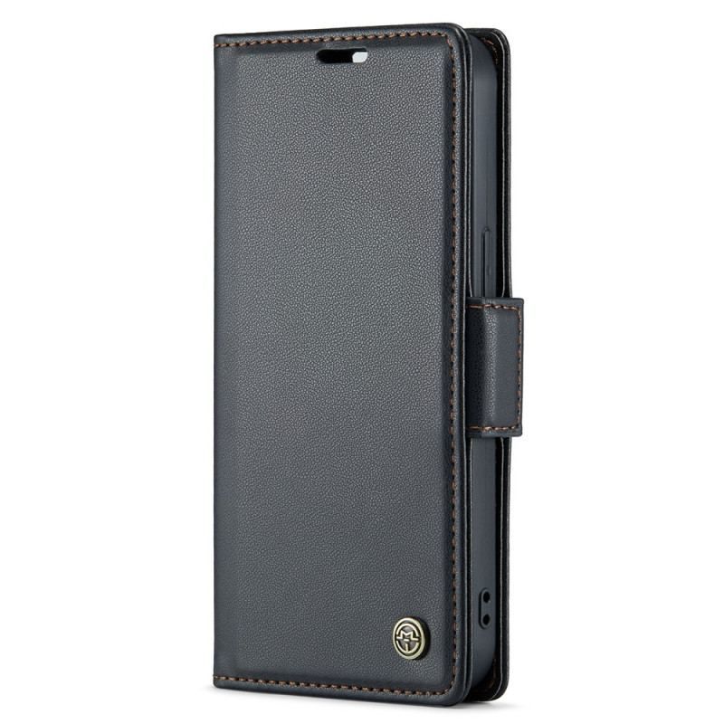 Et Cover I Super Læderstil, Designet Af Caseme Til Iphone 15. Som Fungerer Som En Pung Og Beskytter Kort Mod Datatyveri.