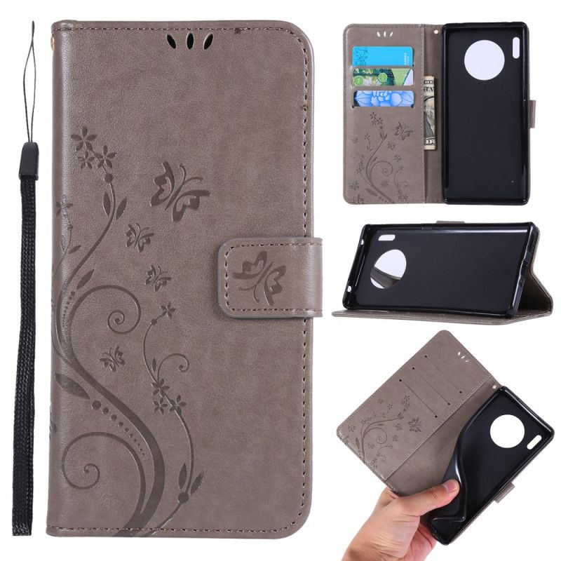 Flip Cover Læder Huawei Mate 30 Pro Sort Sommerfugle Og Blomsterbånd Beskyttelse