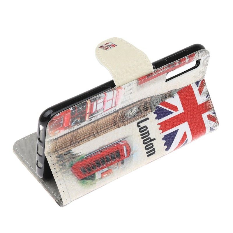 Et mousserende og farverigt cover med forskellige London-mønstre til Samsung Galaxy A70.