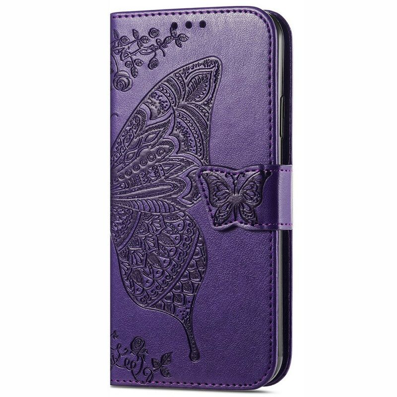 Den fungerer også som en pung med kort-/seddelholdere, og den fungerer også som et stativ.- Cover med sommerfugledesign / imiteret læder