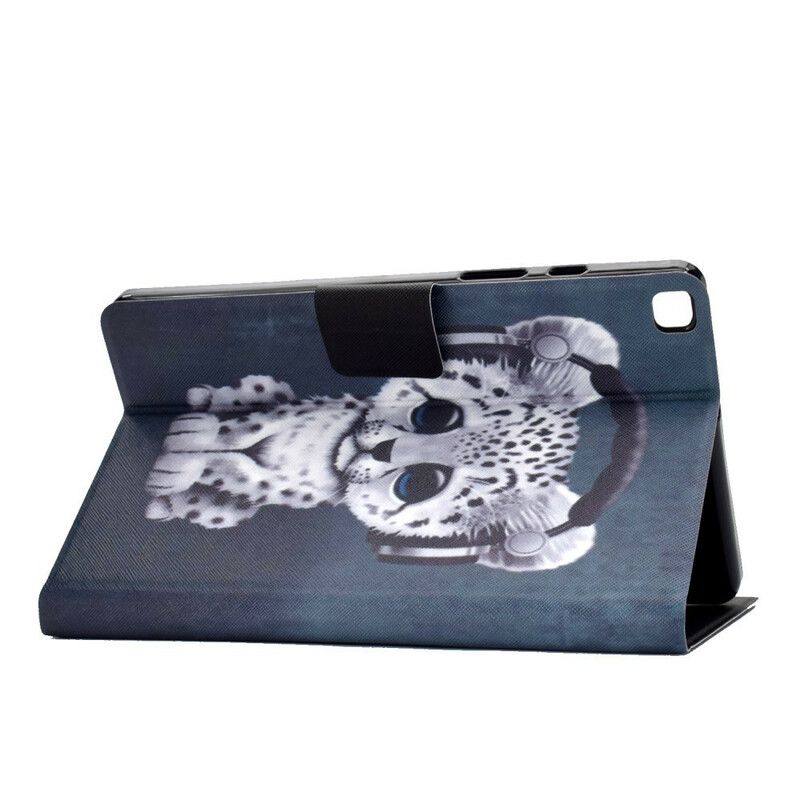 Et Samsung Galaxy Tab A7 Lite Little Leopard etui, der nyder at lytte til den musik, det nyder.