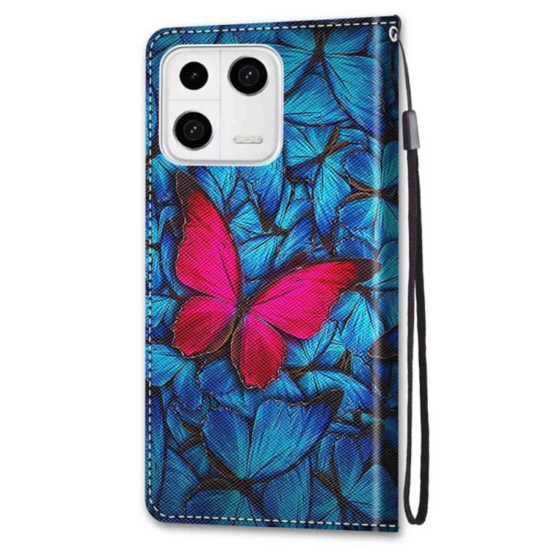 Flip Cover Xiaomi 13 Rød Sommerfugl Blå Baggrund